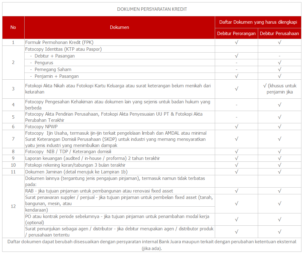 - Debitur dapat berupa perorangan (termasuk UD, PD, Toko), CV danPT.